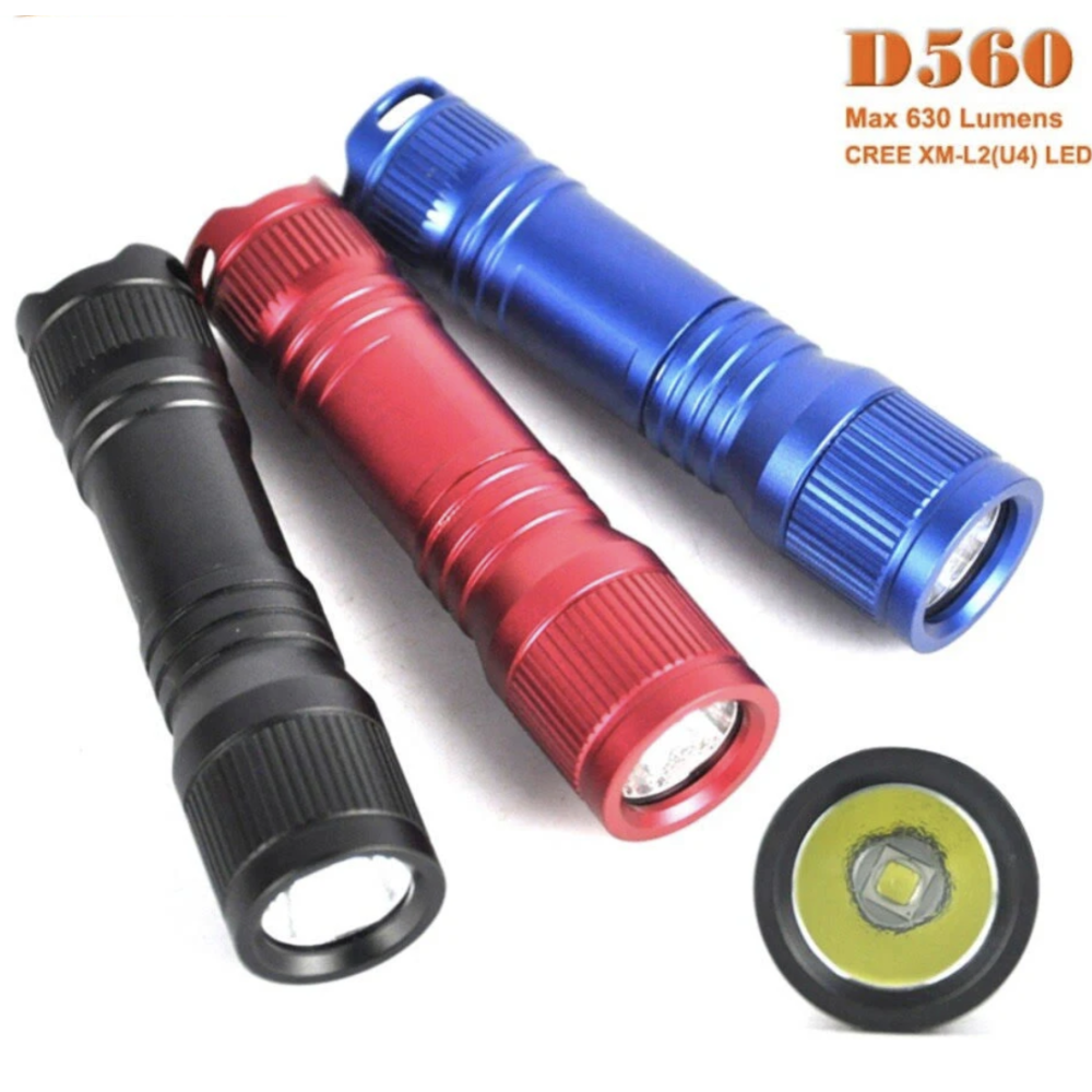 OrcaTorch D560 is a mini dive light with only 9 cm in length. Its max output can reach 700 lumens by using a single 14500 battery, and the longest runtime is 1h25min by using one AA battery. The light can rotate 360°angle with Orcatorch MX05 mask mount.